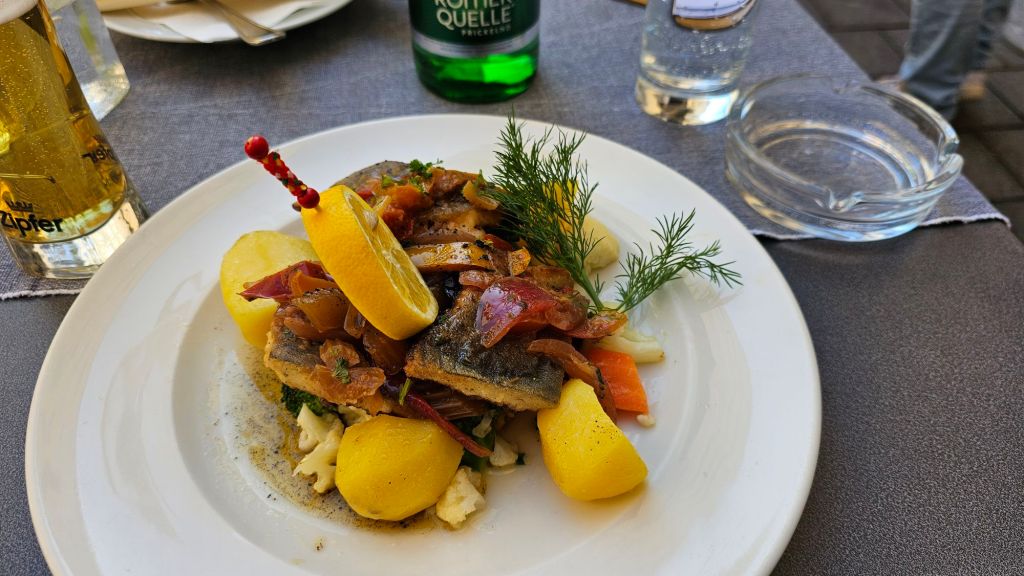 I ended up at Restaurant Zum Eulenspiegel, where I opted to take a break from all the red meat and potatoes I’d been eating and ordered a fish dish. The had something called char, which ended up being like a mix between salmon and trout. It was delicious and a nice surprise.